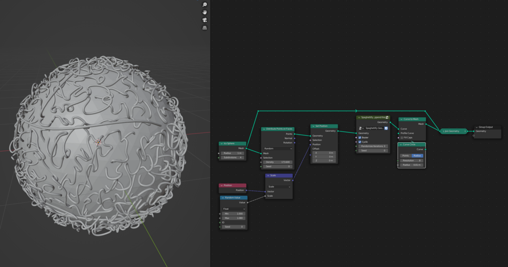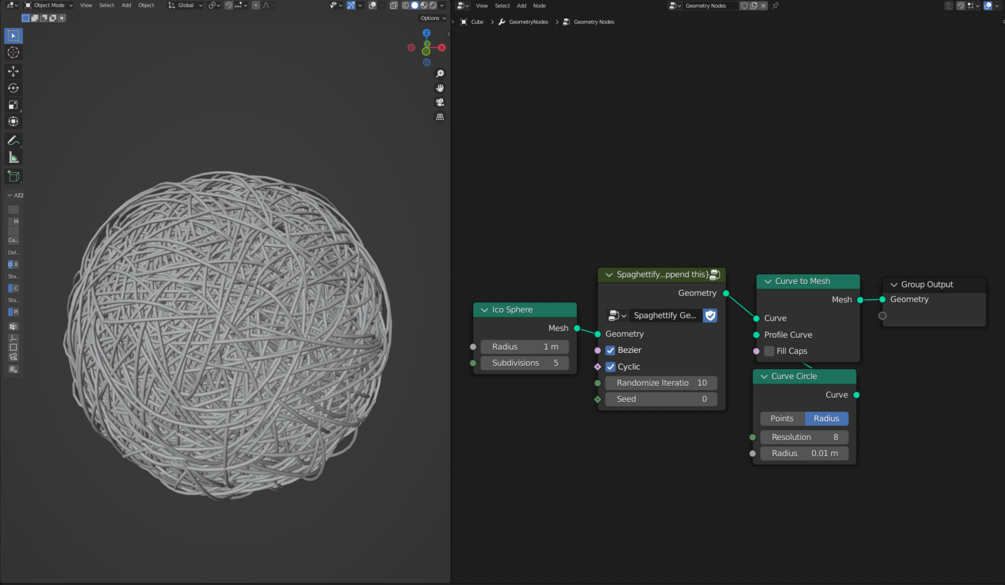 input geometry mesh/curve/point cloud. and the node will output a curve between all the points with a few settings like randomize to give it more Spaghetti look.